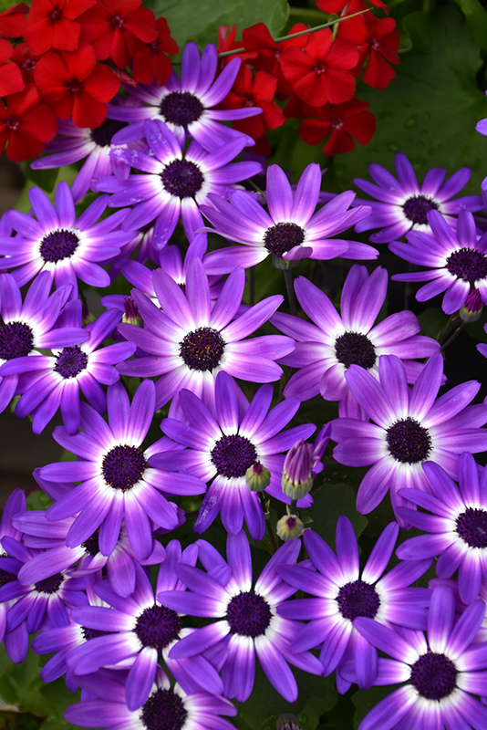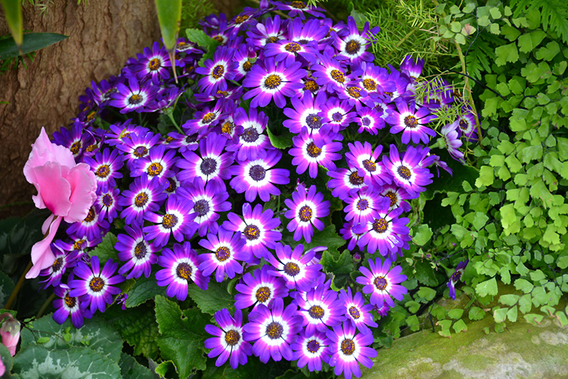 Planting & Growing Senetti® Blue Bicolor Pericallis will grow to be about 24 inches tall at maturity, with a spread of 24 inches. When grown in masses or used as a bedding plant, individual plants should be spaced approximately 18 inches apart. Its foliage tends to remain dense right to the ground, not requiring facer plants in front. This fast-growing annual will normally live for one full growing season, needing replacement the following year. This plant does best in full sun to partial shade. It does best in average to evenly moist conditions, but will not tolerate standing water. It is not particular as to soil type or pH. It is highly tolerant of urban pollution and will even thrive in inner city environments. This particular variety is an interspecific hybrid. It can be propagated by cuttings; however, as a cultivated variety, be aware that it may be subject to certain restrictions or prohibitions on propagation. Senetti® Blue Bicolor Pericallis is a fine choice for the garden, but it is also a good selection for planting in outdoor containers and hanging baskets. It can be used either as 'filler' or as a 'thriller' in the 'spiller-thriller-filler' container combination, depending on the height and form of the other plants used in the container planting. It is even sizeable enough that it can be grown alone in a suitable container. Note that when growing plants in outdoor containers and baskets, they may require more frequent waterings than they would in the yard or garden. Characteristics