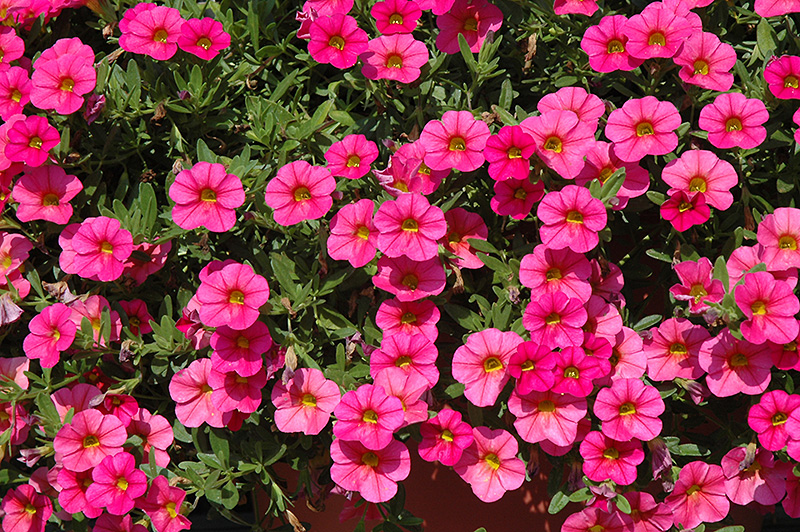 Planting & Growing Cabaret® Hot Pink Calibrachoa will grow to be about 10 inches tall at maturity, with a spread of 18 inches. When grown in masses or used as a bedding plant, individual plants should be spaced approximately 12 inches apart. Its foliage tends to remain low and dense right to the ground. This fast-growing annual will normally live for one full growing season, needing replacement the following year. This plant does best in full sun to partial shade. It does best in average to evenly moist conditions, but will not tolerate standing water. It is not particular as to soil type or pH. It is highly tolerant of urban pollution and will even thrive in inner city environments. This particular variety is an interspecific hybrid. It can be propagated by cuttings; however, as a cultivated variety, be aware that it may be subject to certain restrictions or prohibitions on propagation. Cabaret® Hot Pink Calibrachoa is a fine choice for the garden, but it is also a good selection for planting in outdoor containers and hanging baskets. Because of its trailing habit of growth, it is ideally suited for use as a 'spiller' in the 'spiller-thriller-filler' container combination; plant it near the edges where it can spill gracefully over the pot. Note that when growing plants in outdoor containers and baskets, they may require more frequent waterings than they would in the yard or garden. Characteristics