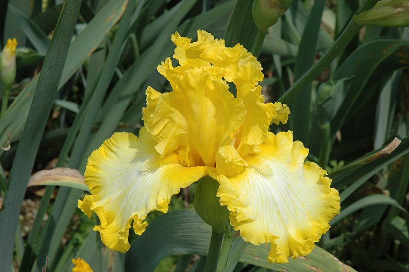 Hardiness Zone: 3 Group/Class: Tall Bearded Description: This vibrant iris produces spectacular, frilly yellow standards with white falls edged in yellow, and white tipped beards; a stunning addition to the perennial border; also excellent massed in groupings in the garden; will quickly form dense colonies Ornamental Features That's All Folks Iris has masses of beautiful yellow flag-like flowers with white overtones and a yellow beard at the ends of the stems from mid to late spring, which are most effective when planted in groupings. The flowers are excellent for cutting. Its sword-like leaves remain grayish green in colour throughout the season. Landscape Attributes That's All Folks Iris is an herbaceous perennial with an upright spreading habit of growth. Its medium texture blends into the garden, but can always be balanced by a couple of finer or coarser plants for an effective composition. This plant will require occasional maintenance and upkeep, and should be cut back in late fall in preparation for winter. Deer don't particularly care for this plant and will usually leave it alone in favor of tastier treats. Gardeners should be aware of the following characteristic(s) that may warrant special consideration;