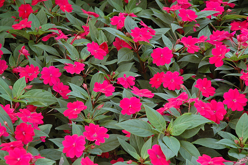 Planting & Growing Bounce™ Cherry Impatiens will grow to be about 20 inches tall at maturity, with a spread of 20 inches. When grown in masses or used as a bedding plant, individual plants should be spaced approximately 18 inches apart. Its foliage tends to remain dense right to the ground, not requiring facer plants in front. This fast-growing annual will normally live for one full growing season, needing replacement the following year. This plant does best in partial shade to shade. It does best in average to evenly moist conditions, but will not tolerate standing water. It is not particular as to soil type or pH. It is highly tolerant of urban pollution and will even thrive in inner city environments. This particular variety is an interspecific hybrid. It can be propagated by cuttings; however, as a cultivated variety, be aware that it may be subject to certain restrictions or prohibitions on propagation. Bounce™ Cherry Impatiens is a fine choice for the garden, but it is also a good selection for planting in outdoor containers and hanging baskets. It can be used either as 'filler' or as a 'thriller' in the 'spiller-thriller-filler' container combination, depending on the height and form of the other plants used in the container planting. Note that when growing plants in outdoor containers and baskets, they may require more frequent waterings than they would in the yard or garden. Characteristics
