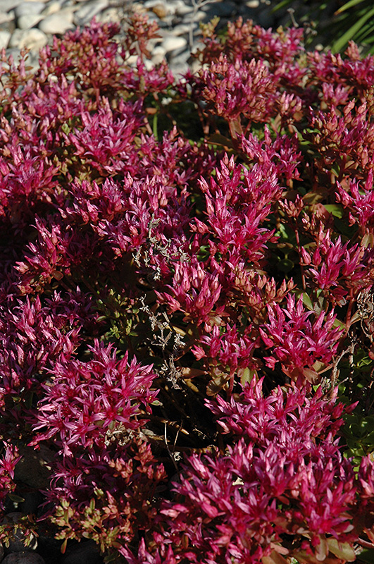 Hardiness Zone: 2 Other Names: Two Row Stonecrop Description: A vigorous perennial groundcover with small succulent foliage which emerges colorful shades of red, eventually fading to dark green; flowers a sea of deep cherry red in summer, spreads rapidly to form a dense low mat; needs a dry and sunny location Ornamental Features Dragon's Blood Stonecrop is smothered in stunning rose star-shaped flowers at the ends of the stems from early to mid summer. Its attractive tiny succulent round leaves emerge burgundy in spring, turning dark green in colour with distinctive dark red edges. As an added bonus, the foliage turns a gorgeous dark red in the fall. Landscape Attributes Dragon's Blood Stonecrop is a dense herbaceous perennial with a ground-hugging habit of growth. It brings an extremely fine and delicate texture to the garden composition and should be used to full effect. This plant will require occasional maintenance and upkeep, and is best cleaned up in early spring before it resumes active growth for the season. Deer don't particularly care for this plant and will usually leave it alone in favor of tastier treats. Gardeners should be aware of the following characteristic(s) that may warrant special consideration;
