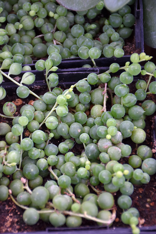 Other Names: String Of Beads Description: An interesting and unusual trailing succulent with spherical green foliage strung along the branches; a dramatic accent spilling over the edges of containers and hanging baskets Features & Attributes String Of Pearls' attractive succulent round leaves remain green in colour throughout the year on a plant with a trailing habit of growth. This is an herbaceous evergreen houseplant with a trailing habit of growth, eventually spilling over the edges of hanging baskets and containers. Its extremely fine and delicate texture is quite ornamental and should be used to full effect. This plant usually looks its best without pruning, although it will tolerate pruning. Planting & Growing When grown indoors, String Of Pearls can be expected to grow to be only 2 inches tall at maturity, with a spread of 3 feet. It grows at a medium rate, and under ideal conditions can be expected to live for approximately 10 years. This houseplant will do well in a location that gets either direct or indirect sunlight, although it will usually require a more brightly-lit environment than what artificial indoor lighting alone can provide. It prefers dry to average moisture levels with very well-drained soil, and may die if left in standing water for any length of time. This plant should be watered when the surface of the soil gets dry, and will need watering approximately once each week. Be aware that your particular watering schedule may vary depending on its location in the room, the pot size, plant size and other conditions; if in doubt, ask one of our experts in the store for advice. It is not particular as to soil type or pH; an average potting soil should work just fine. There are many factors that will affect the ultimate height, spread and overall performance of a plant when grown indoors; among them, the size of the pot it's growing in, the amount of light it receives, watering frequency, the pruning regimen and repotting schedule. Use the information described here as a guideline only; individual performance can and will vary. Please contact the store to speak with one of our experts if you are interested in further details concerning recommendations on pot size, watering, pruning, repotting, etc. -- THIS IS A HOUSEPLANT AND IS NOT MEANT TO SURVIVE THE WINTER OUTDOORS IN OUR CLIMATE -- Characteristics