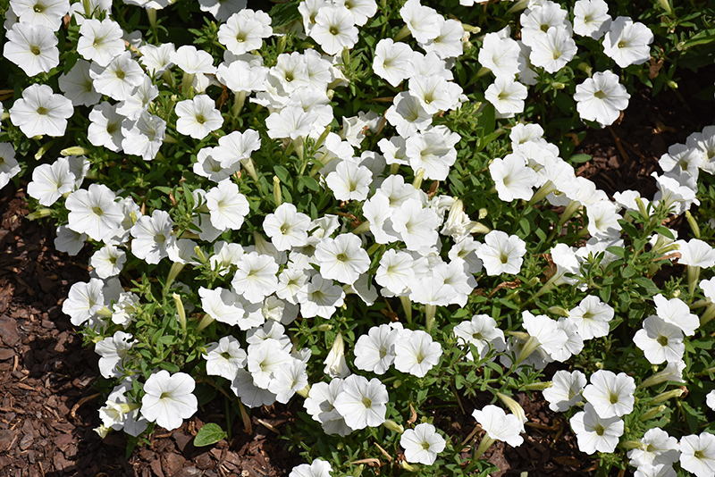 Planting & Growing Supertunia Vista® Snowdrift™ Petunia will grow to be about 24 inches tall at maturity, with a spread of 3 feet. When grown in masses or used as a bedding plant, individual plants should be spaced approximately 20 inches apart. Its foliage tends to remain dense right to the ground, not requiring facer plants in front. This fast-growing annual will normally live for one full growing season, needing replacement the following year. This plant does best in full sun to partial shade. It prefers to grow in average to moist conditions, and shouldn't be allowed to dry out. It is not particular as to soil type or pH. It is highly tolerant of urban pollution and will even thrive in inner city environments. This particular variety is an interspecific hybrid. It can be propagated by cuttings; however, as a cultivated variety, be aware that it may be subject to certain restrictions or prohibitions on propagation. Supertunia Vista® Snowdrift™ Petunia is a fine choice for the garden, but it is also a good selection for planting in outdoor containers and hanging baskets. Because of its trailing habit of growth, it is ideally suited for use as a 'spiller' in the 'spiller-thriller-filler' container combination; plant it near the edges where it can spill gracefully over the pot. It is even sizeable enough that it can be grown alone in a suitable container. Note that when growing plants in outdoor containers and baskets, they may require more frequent waterings than they would in the yard or garden. Characteristics