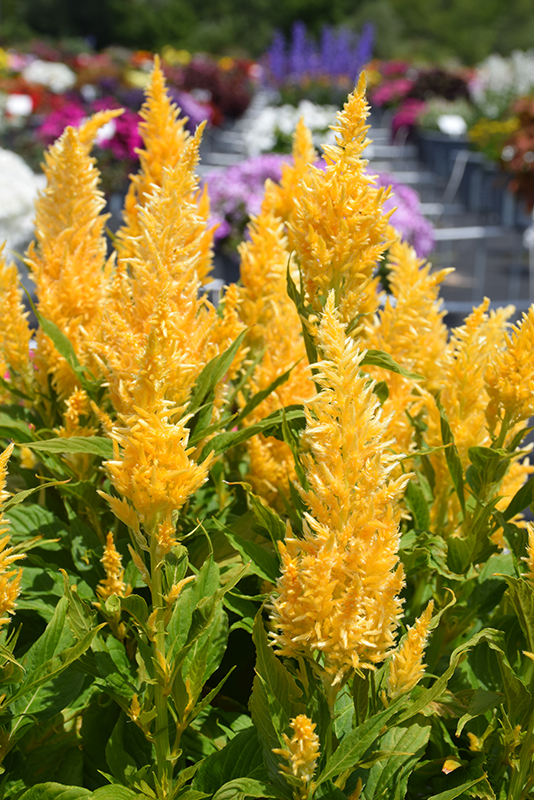 Planting & Growing Kelos® Fire Yellow Celosia will grow to be about 14 inches tall at maturity, with a spread of 14 inches. When grown in masses or used as a bedding plant, individual plants should be spaced approximately 10 inches apart. Its foliage tends to remain dense right to the ground, not requiring facer plants in front. This fast-growing annual will normally live for one full growing season, needing replacement the following year. This plant should only be grown in full sunlight. It is very adaptable to both dry and moist growing conditions, but will not tolerate any standing water. It is considered to be drought-tolerant, and thus makes an ideal choice for a low-water garden or xeriscape application. It is not particular as to soil type or pH. It is highly tolerant of urban pollution and will even thrive in inner city environments. This particular variety is an interspecific hybrid. It can be propagated by cuttings; however, as a cultivated variety, be aware that it may be subject to certain restrictions or prohibitions on propagation. Kelos® Fire Yellow Celosia is a fine choice for the garden, but it is also a good selection for planting in outdoor containers and hanging baskets. It is often used as a 'filler' in the 'spiller-thriller-filler' container combination, providing a mass of flowers against which the larger thriller plants stand out. Note that when growing plants in outdoor containers and baskets, they may require more frequent waterings than they would in the yard or garden. Characteristics