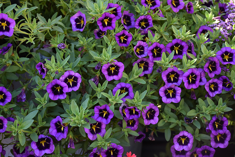 Planting & Growing Cabaret® Midnight Kiss Calibrachoa will grow to be about 8 inches tall at maturity, with a spread of 12 inches. When grown in masses or used as a bedding plant, individual plants should be spaced approximately 12 inches apart. Its foliage tends to remain low and dense right to the ground. This fast-growing annual will normally live for one full growing season, needing replacement the following year. This plant does best in full sun to partial shade. It does best in average to evenly moist conditions, but will not tolerate standing water. This plant should not require much in the way of fertilizing once established, although it may appreciate a shot of general-purpose fertilizer from time to time early in the growing season. It is not particular as to soil type or pH. It is highly tolerant of urban pollution and will even thrive in inner city environments. This particular variety is an interspecific hybrid. It can be propagated by cuttings; however, as a cultivated variety, be aware that it may be subject to certain restrictions or prohibitions on propagation. Cabaret® Midnight Kiss Calibrachoa is a fine choice for the garden, but it is also a good selection for planting in outdoor containers and hanging baskets. Because of its trailing habit of growth, it is ideally suited for use as a 'spiller' in the 'spiller-thriller-filler' container combination; plant it near the edges where it can spill gracefully over the pot. Note that when growing plants in outdoor containers and baskets, they may require more frequent waterings than they would in the yard or garden. Characteristics