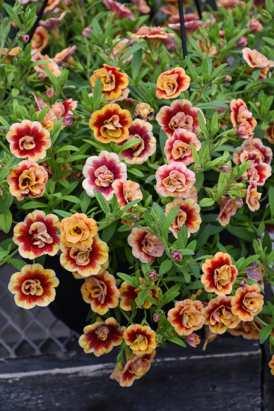 Planting & Growing MiniFamous® Neo Double OrangeTastic Calibrachoa will grow to be about 12 inches tall at maturity, with a spread of 15 inches. When grown in masses or used as a bedding plant, individual plants should be spaced approximately 15 inches apart. Its foliage tends to remain dense right to the ground, not requiring facer plants in front. This fast-growing annual will normally live for one full growing season, needing replacement the following year. This plant does best in full sun to partial shade. It does best in average to evenly moist conditions, but will not tolerate standing water. This plant should not require much in the way of fertilizing once established, although it may appreciate a shot of general-purpose fertilizer from time to time early in the growing season. It is not particular as to soil type or pH. It is highly tolerant of urban pollution and will even thrive in inner city environments. This particular variety is an interspecific hybrid. It can be propagated by cuttings; however, as a cultivated variety, be aware that it may be subject to certain restrictions or prohibitions on propagation. MiniFamous® Neo Double OrangeTastic Calibrachoa is a fine choice for the garden, but it is also a good selection for planting in outdoor containers and hanging baskets. Because of its trailing habit of growth, it is ideally suited for use as a 'spiller' in the 'spiller-thriller-filler' container combination; plant it near the edges where it can spill gracefully over the pot. Note that when growing plants in outdoor containers and baskets, they may require more frequent waterings than they would in the yard or garden. Characteristics