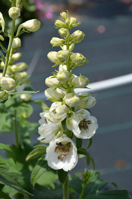 Planting & Growing Delphina™ White Black Bee Larkspur will grow to be about 14 inches tall at maturity, with a spread of 10 inches. When grown in masses or used as a bedding plant, individual plants should be spaced approximately 8 inches apart. It tends to be leggy, with a typical clearance of 1 foot from the ground, and should be underplanted with lower-growing perennials. It grows at a medium rate, and under ideal conditions can be expected to live for approximately 10 years. As an herbaceous perennial, this plant will usually die back to the crown each winter, and will regrow from the base each spring. Be careful not to disturb the crown in late winter when it may not be readily seen! This plant should only be grown in full sunlight. It prefers to grow in average to moist conditions, and shouldn't be allowed to dry out. To help this plant achive its best flowering performance, periodically apply a flower-boosting fertilizer from early spring through into the active growing season. It is not particular as to soil type or pH. It is somewhat tolerant of urban pollution. This particular variety is an interspecific hybrid, and parts of it are known to be toxic to humans and animals, so care should be exercised in planting it around children and pets. It can be propagated by division; however, as a cultivated variety, be aware that it may be subject to certain restrictions or prohibitions on propagation. Delphina™ White Black Bee Larkspur is a fine choice for the garden, but it is also a good selection for planting in outdoor pots and containers. It is often used as a 'filler' in the 'spiller-thriller-filler' container combination, providing a mass of flowers against which the larger thriller plants stand out. Note that when growing plants in outdoor containers and baskets, they may require more frequent waterings than they would in the yard or garden. Be aware that in our climate, most plants cannot be expected to survive the winter if left in containers outdoors, and this plant is no exception. Contact our experts for more information on how to protect it over the winter months. Characteristics