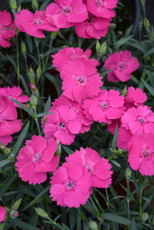 Hardiness Zone: 3 Other Names: Border Pinks, Cheddar Pinks Brand: Dummen Orange Description: An upright, mounding selection presenting vivid magenta pink flowers above attractive blue-green foliage; great for flower arrangements; deadhead to rebloom; pair up with summer blooming perennials and annuals to time a continued flower display Ornamental Features Mad Magenta Pinks is smothered in stunning fragrant hot pink frilly flowers at the ends of the stems from late spring to late summer. The flowers are excellent for cutting. Its attractive narrow leaves remain grayish green in colour with hints of silvery blue throughout the year. Landscape Attributes Mad Magenta Pinks is an herbaceous evergreen perennial with a mounded form. It brings an extremely fine and delicate texture to the garden composition and should be used to full effect. This is a relatively low maintenance plant, and is best cleaned up in early spring before it resumes active growth for the season. It is a good choice for attracting bees and butterflies to your yard, but is not particularly attractive to deer who tend to leave it alone in favor of tastier treats. It has no significant negative characteristics. Mad Magenta Pinks is recommended for the following landscape applications;