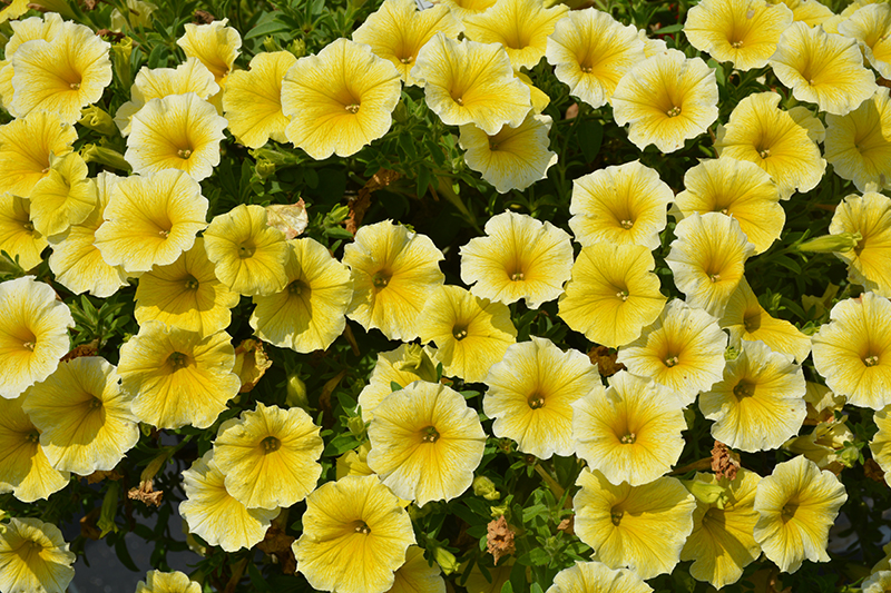 Hardiness Zone: (annual) Group/Class: Supertunia Series Brand: Proven Winners Description: A vigorous, self cleaning series providing stunning color as both a spiller or thriller in hanging baskets and containers; brightly colored flowers bloom throughout the season for added interest; heat and drought tolerant; a great choice for border fronts Ornamental Features Supertunia® Saffron Finch™ Petunia is clothed in stunning yellow trumpet-shaped flowers with gold throats and creamy white edges at the ends of the stems from mid spring to mid fall. Its pointy leaves remain green in colour throughout the season. Landscape Attributes Supertunia® Saffron Finch™ Petunia is a dense herbaceous annual with a trailing habit of growth, eventually spilling over the edges of hanging baskets and containers. Its medium texture blends into the garden, but can always be balanced by a couple of finer or coarser plants for an effective composition. This plant will require occasional maintenance and upkeep. Trim off the flower heads after they fade and die to encourage more blooms late into the season. It is a good choice for attracting butterflies and hummingbirds to your yard, but is not particularly attractive to deer who tend to leave it alone in favor of tastier treats. It has no significant negative characteristics. Supertunia® Saffron Finch™ Petunia is recommended for the following landscape applications;