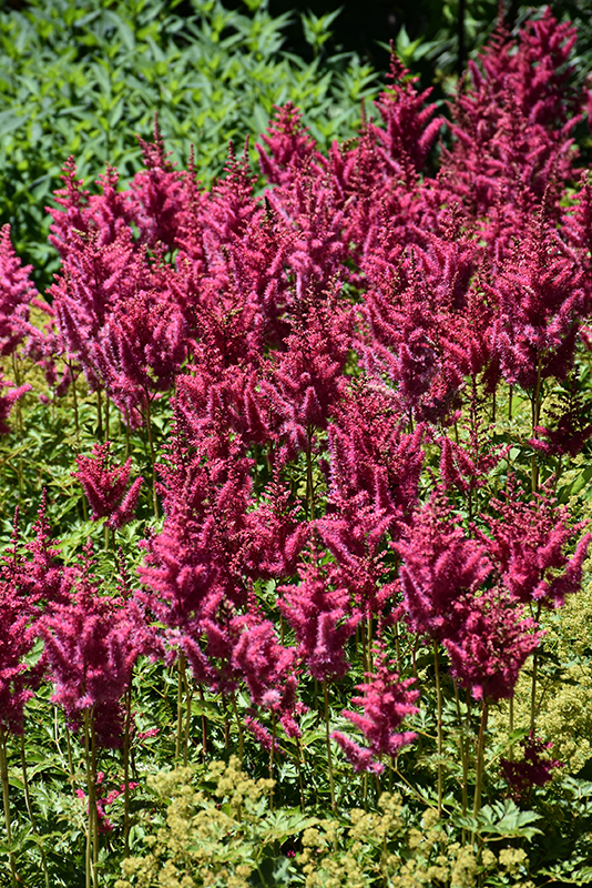 Planting & Growing Mighty™ Red Quin Chinese Astilbe will grow to be about 3 feet tall at maturity extending to 4 feet tall with the flowers, with a spread of 30 inches. When grown in masses or used as a bedding plant, individual plants should be spaced approximately 24 inches apart. Its foliage tends to remain dense right to the ground, not requiring facer plants in front. It grows at a medium rate, and under ideal conditions can be expected to live for approximately 10 years. As an herbaceous perennial, this plant will usually die back to the crown each winter, and will regrow from the base each spring. Be careful not to disturb the crown in late winter when it may not be readily seen! This plant does best in partial shade to shade. It requires an evenly moist well-drained soil for optimal growth. It is very fussy about its soil conditions and must have rich, acidic soils to ensure success, and is subject to chlorosis (yellowing) of the foliage in alkaline soils. It is somewhat tolerant of urban pollution, and will benefit from being planted in a relatively sheltered location. Consider applying a thick mulch around the root zone over the growing season to conserve soil moisture. This is a selected variety of a species not originally from North America. It can be propagated by division; however, as a cultivated variety, be aware that it may be subject to certain restrictions or prohibitions on propagation. Mighty™ Red Quin Chinese Astilbe is a fine choice for the garden, but it is also a good selection for planting in outdoor pots and containers. With its upright habit of growth, it is best suited for use as a 'thriller' in the 'spiller-thriller-filler' container combination; plant it near the center of the pot, surrounded by smaller plants and those that spill over the edges. It is even sizeable enough that it can be grown alone in a suitable container. Note that when growing plants in outdoor containers and baskets, they may require more frequent waterings than they would in the yard or garden. Be aware that in our climate, most plants cannot be expected to survive the winter if left in containers outdoors, and this plant is no exception. Contact our experts for more information on how to protect it over the winter months. Characteristics