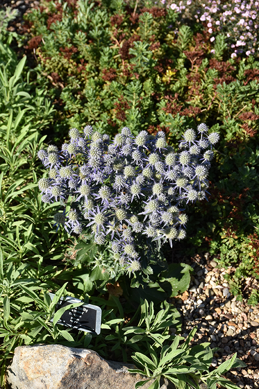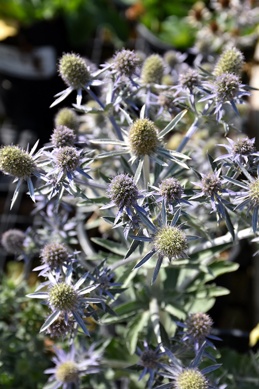 Planting & Growing Blue Hobbit Sea Holly will grow to be about 12 inches tall at maturity extending to 18 inches tall with the flowers, with a spread of 12 inches. When grown in masses or used as a bedding plant, individual plants should be spaced approximately 10 inches apart. Its foliage tends to remain dense right to the ground, not requiring facer plants in front. It grows at a medium rate, and under ideal conditions can be expected to live for approximately 10 years. As an herbaceous perennial, this plant will usually die back to the crown each winter, and will regrow from the base each spring. Be careful not to disturb the crown in late winter when it may not be readily seen! This plant should only be grown in full sunlight. It prefers dry to average moisture levels with very well-drained soil, and will often die in standing water. It is considered to be drought-tolerant, and thus makes an ideal choice for a low-water garden or xeriscape application. It is particular about its soil conditions, with a strong preference for poor, alkaline soils, and is able to handle environmental salt. It is highly tolerant of urban pollution and will even thrive in inner city environments. This is a selected variety of a species not originally from North America. It can be propagated by cuttings; however, as a cultivated variety, be aware that it may be subject to certain restrictions or prohibitions on propagation. Blue Hobbit Sea Holly is a fine choice for the garden, but it is also a good selection for planting in outdoor pots and containers. It is often used as a 'filler' in the 'spiller-thriller-filler' container combination, providing a mass of flowers and foliage against which the thriller plants stand out. Note that when growing plants in outdoor containers and baskets, they may require more frequent waterings than they would in the yard or garden. Be aware that in our climate, most plants cannot be expected to survive the winter if left in containers outdoors, and this plant is no exception. Contact our experts for more information on how to protect it over the winter months. Characteristics