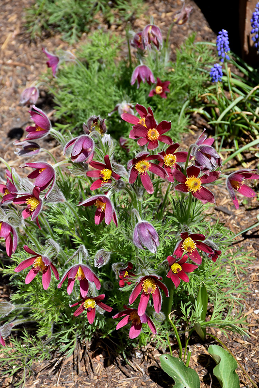 Planting & Growing Red Pasqueflower will grow to be about 8 inches tall at maturity extending to 12 inches tall with the flowers, with a spread of 12 inches. When grown in masses or used as a bedding plant, individual plants should be spaced approximately 10 inches apart. It grows at a slow rate, and under ideal conditions can be expected to live for approximately 5 years. As an herbaceous perennial, this plant will usually die back to the crown each winter, and will regrow from the base each spring. Be careful not to disturb the crown in late winter when it may not be readily seen! This plant does best in full sun to partial shade. It is very adaptable to both dry and moist growing conditions, but will not tolerate any standing water. It is considered to be drought-tolerant, and thus makes an ideal choice for a low-water garden or xeriscape application. It is not particular as to soil type or pH. It is somewhat tolerant of urban pollution. Consider covering it with a thick layer of mulch in winter to protect it in exposed locations or colder microclimates. This is a selected variety of a species not originally from North America. Characteristics